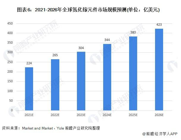 在市場(chǎng)前景方面,氮化鎵是研制微電子器件、光電子器件的新型半導(dǎo)體材料,在光電子、激光器、高溫大功率器件和高頻微波器件應(yīng)用方面有著廣闊的前景。隨著各個(gè)國(guó)家對(duì)第三代半導(dǎo)體材料的重視,氮化鎵半導(dǎo)體材料市場(chǎng)發(fā)展迅速。參考Market and Market 、Yole等機(jī)構(gòu)的增長(zhǎng)幅度測(cè)算,預(yù)計(jì)到2026年全球氮化鎵元件市場(chǎng)規(guī)模將增長(zhǎng)到423億美元,年均復(fù)合增長(zhǎng)率約為13.5%。