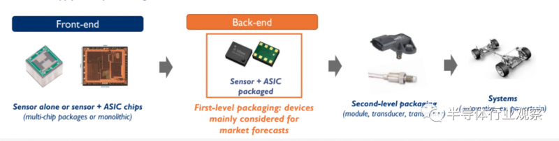 首先,MEMS作為半導(dǎo)體領(lǐng)域的重要分支,是實(shí)現(xiàn)人機(jī)交互接口的賦能者。MEMS是包括在µm - mm范圍內(nèi)的半導(dǎo)體器件,包括微機(jī)電系統(tǒng)(micro-electro-mechanical systems,MEMS)麥克風(fēng)、MEMS加速度計(jì)、MEMS陀螺儀、MEMS壓力傳感器等。MEMS傳感器芯片由硅制成(前端制造),一般與ASIC芯片組裝,并采用一級(jí)封裝(后端制造)。二級(jí)封裝進(jìn)一步增加了電子器件、堅(jiān)固的外殼和連接器。在這個(gè)報(bào)告中,Yole只考慮了一級(jí)封裝的價(jià)值,而不是二級(jí)模塊的價(jià)值。當(dāng)然也有例外情況,Yole認(rèn)為,對(duì)于直接集成芯片的二級(jí)封裝應(yīng)用(汽車(chē)暖通空調(diào)或石油等),理論上等同于一級(jí)封裝價(jià)值。