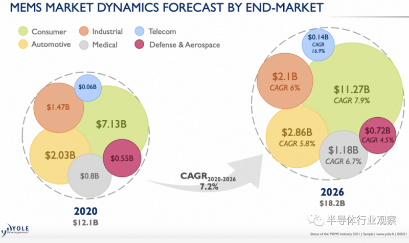 據(jù)Yole的預(yù)計(jì),2020-2026年MEMS終端市場(chǎng)將以7.2%的年復(fù)合增長(zhǎng)率增長(zhǎng)。其中,消費(fèi)領(lǐng)域是最大的MEMS應(yīng)用市場(chǎng),約占全球 MEMS 收入的 60%,到2026年約有112.7億美元的市場(chǎng)。其次是汽車(chē),汽車(chē)對(duì)MEMS的需求將從2020年的20.3億美元上升到28.6億美元。剩下的應(yīng)用市場(chǎng)還有工業(yè)領(lǐng)域、醫(yī)療、電信、國(guó)防與航空航天等。