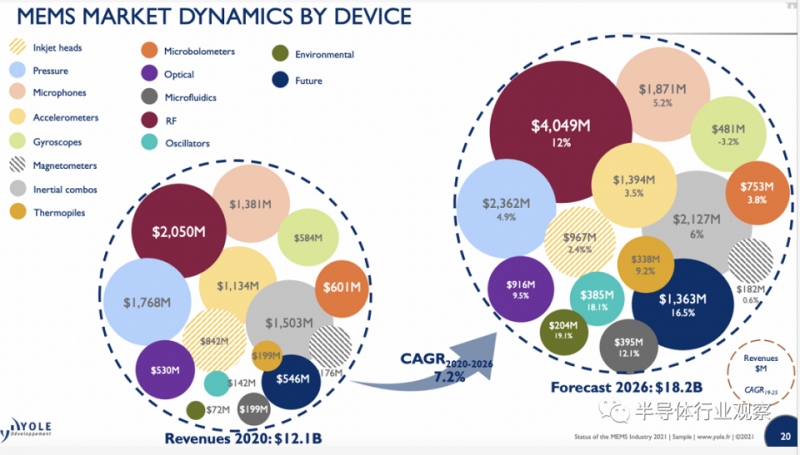 從MEMS器件方面來(lái)看,Yole預(yù)計(jì),整體MEMS器件市場(chǎng)在2020年至2026年將以7.2%的年復(fù)合增長(zhǎng)率增長(zhǎng),到2026年全球MEMS器件市場(chǎng)空間將達(dá)到182億美元。在這其中,射頻MEMS器件占大頭,到2026年射頻MEMS器件大約有40.4億美元的市場(chǎng)空間,壓力MEMS器件大約是23.62億美元,慣性器件約有21.27億美元,麥克風(fēng)MEMS約是18.71億美元,然后是加速器、噴墨頭、光學(xué)、微型測(cè)輻射熱儀、陀螺儀、微流體等等。