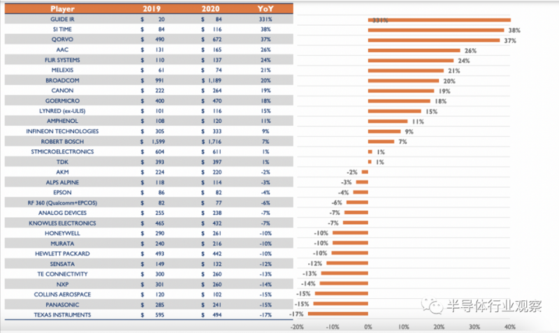 前30名MEMS玩家2020年的增長(zhǎng)率排名