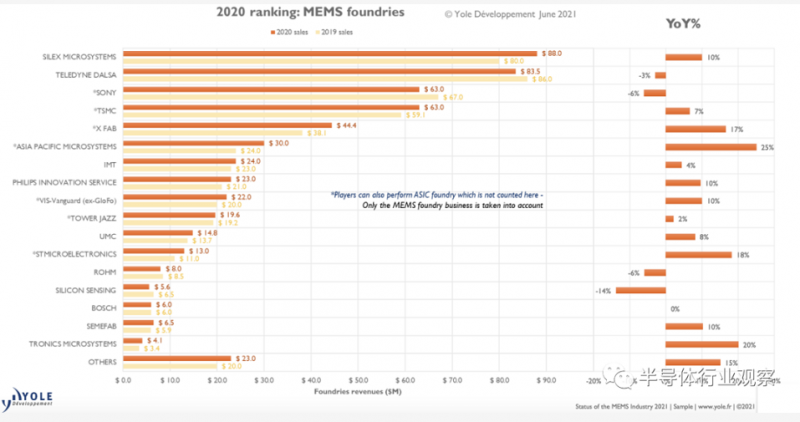 瑞典的Silex Microsystems 是頂級(jí)的 MEMS 代工廠,Teledyne DALSA 位居第二,索尼位居第三。臺(tái)積電位居第4位,X-Fab位居第5位。除索尼外,羅姆在日本企業(yè)中排名第13位。