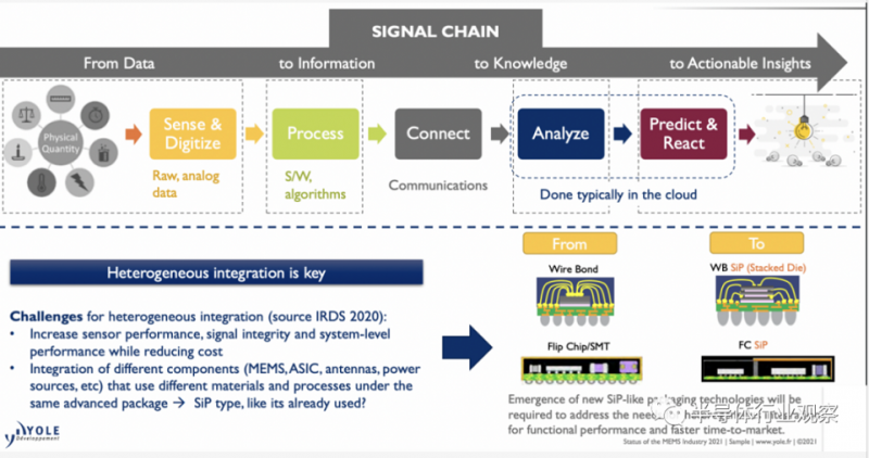 作為一種技術(shù)趨勢(shì),MEMS傳感器和執(zhí)行器不斷致力于縮小尺寸、降低成本和提高性能,并正在轉(zhuǎn)向以異構(gòu)功能集成為關(guān)鍵的系統(tǒng)化。從前端制造到封裝、模塊和系統(tǒng)集成,整個(gè)供應(yīng)鏈都朝著混合能力的方向發(fā)展。