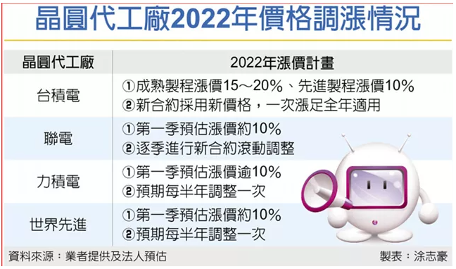 據(jù)臺(tái)媒《工商時(shí)報(bào)》報(bào)道,根據(jù)業(yè)內(nèi)預(yù)估,臺(tái)積電方面明年漲幅在10%-20%之間,價(jià)格全年適用,聯(lián)電、力積電、世界先進(jìn)明年第一季度漲價(jià)均超10%,但此后均可能再調(diào)整,其中聯(lián)電逐季滾動(dòng)調(diào)整,力積電、世界先進(jìn)均為每半年調(diào)整一次。