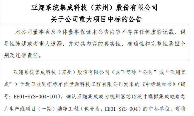 10月25日晚,亞翔系統(tǒng)集成科技(蘇州)股份有限公司(以下簡稱“亞翔集成”)發(fā)布公告稱,公司于近日收到招標(biāo)單位世源科技工程有限公司發(fā)來的《中標(biāo)通知書》,確認(rèn)亞翔集成成為杭州富芯12英寸模擬集成電路芯片生產(chǎn)線項目(一期)潔凈工程的中標(biāo)單位。
