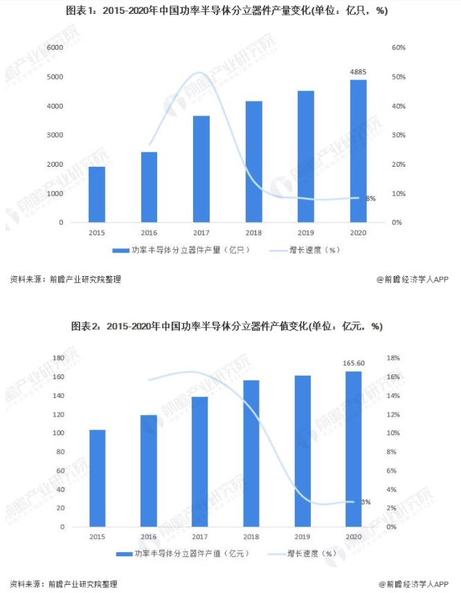 功率半導體分立器件指額定電流不低于1A,或額定功率不低于1W的半導體分立器件。2015-2020年,中國功率半導體分立器件產(chǎn)量和產(chǎn)值均呈現(xiàn)持續(xù)上漲的趨勢。2020年,中國功率半導體分立器件產(chǎn)量為4885億只,較2019年同比增長8%。2020年,中國功率半導體分立器件產(chǎn)值達到165.6億元,較2019年同比增長3%。