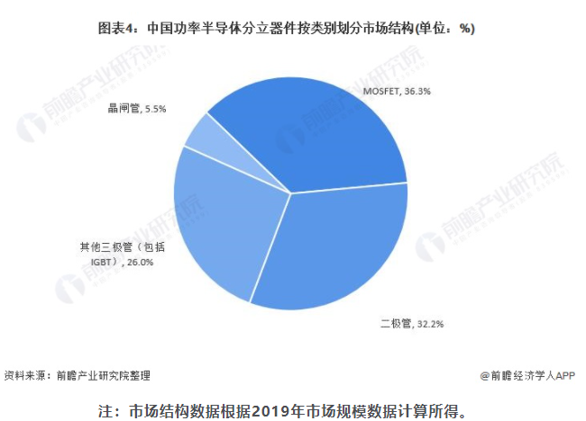 MOSFET在分立功率半導體器件當中排名首位,2019年占市場規(guī)模的36.3%,其次為二極管、其他三極管(包括IGBT)及晶閘管,市場份額分別為32.2%、26.0%及5.5%。