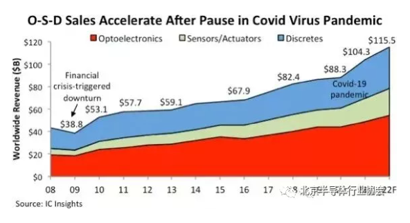 自 1990 年代中期以來,由于傳感器、執(zhí)行器、CMOS 圖像傳感器、激光發(fā)射器和高亮度發(fā)光二極管 (LED) 的穩(wěn)定且通常強(qiáng)勁的年度增長,OSD 市場組逐漸占半導(dǎo)體收入的更高份額。OSD 的銷售受到移動系統(tǒng)(尤其是裝有數(shù)碼相機(jī)和傳感器的智能手機(jī))、高速通信、物聯(lián)網(wǎng) (IoT) 以及近期嵌入式人工智能 (AI) 爆炸式增長的推動。