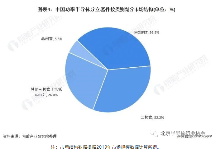 MOSFET在分立功率半導(dǎo)體器件當(dāng)中排名首位,2019年占市場規(guī)模的36.3%,其次為二極管、其他三極管(包括IGBT)及晶閘管,市場份額分別為32.2%、26.0%及5.5%。