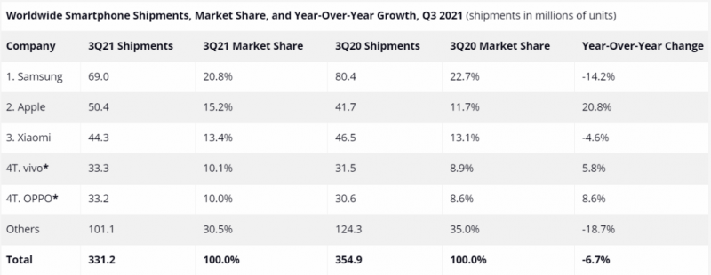 分品牌來看,三星電子以20.8%的份額位居榜首,但主要由于供應(yīng)緊張,出貨量同比下降14.2%。蘋果以15.2%的份額重新占據(jù)第二位,出貨量同比增長20.8%。小米以13.4%的份額占據(jù)第三位,出貨量在經(jīng)歷了前四個季度兩位數(shù)的高增長后,在第三季度下跌了4.6%,還面臨著前幾個季度沒有遇到的供應(yīng)問題。vivo和OPPO并列第四,市場份額分別為10.1%和10.0%,出貨量分別同比增長5.8%和8.6%。