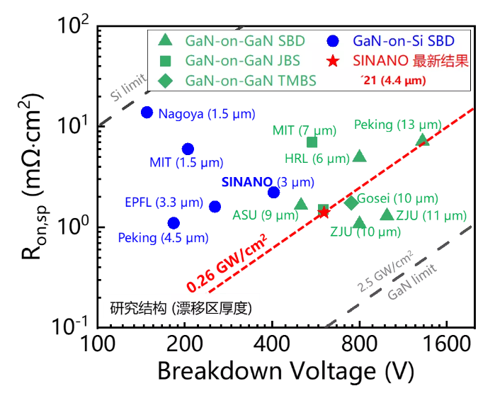 圖2. GaN基縱向功率二極管的關(guān)態(tài)擊穿電壓與開態(tài)導(dǎo)通電阻(Ron,sp)的評價體系。國內(nèi)外相關(guān)研究團(tuán)隊的自支撐襯底和硅襯底GaN基肖特基勢壘二極管(SBD),結(jié)勢壘肖特基二極管(JBS),凹槽MOS型肖特基二極管(TMBS)器件性能的比較。