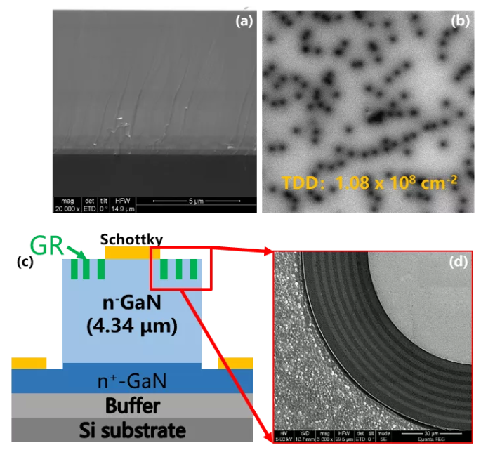 圖3.(a)硅基GaN縱向功率二極管的外延結(jié)構(gòu)(b)外延材料的CLmapping(c)器件的結(jié)構(gòu)示意圖(d)制備器件的離子注入保護(hù)環(huán)。