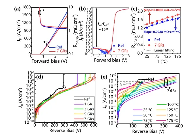 圖4.(a)線性坐標(biāo)下與(b)對數(shù)坐標(biāo)下有、無離子注入保護(hù)環(huán)(GR)終端的硅基GaN縱向SBD的正向IV曲線(c)不同溫度下硅基GaN縱向SBD的開態(tài)導(dǎo)通電阻(d)離子注入保護(hù)環(huán)個數(shù)對反向擊穿耐壓的影響。(e)有、無離子注入保護(hù)環(huán)對硅基GaN縱向SBD溫度特性的影響。