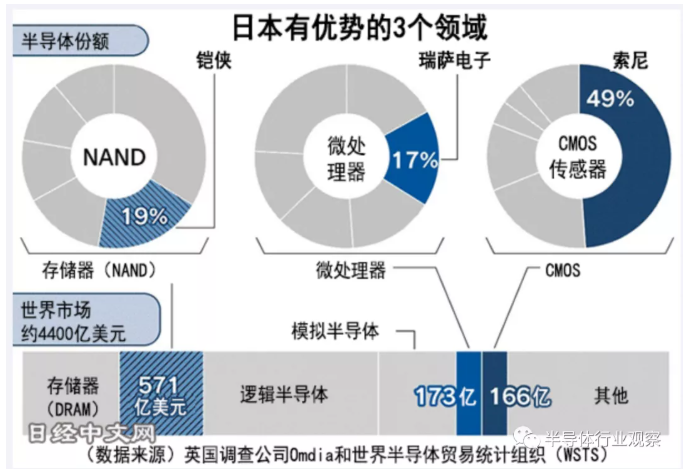 據(jù)悉世界半導(dǎo)體市場的規(guī)模在2020年約為4400億美元,大體上分為存儲器、邏輯半導(dǎo)體等7個領(lǐng)域。日本企業(yè)在NAND存儲器(市場規(guī)模為571億美元)、微處理器(173億美元)和CMOS(互補金屬氧化物半導(dǎo)體)圖像傳感器(166億美元)領(lǐng)域躋身前列。