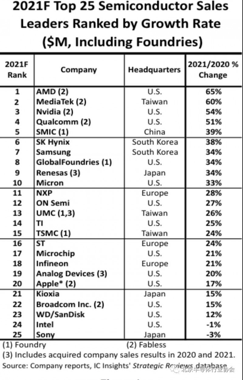 IC Insights還預(yù)測,在25家最大的半導(dǎo)體公司中,有10家今年的半導(dǎo)體收入將增長 30% 以上,23家預(yù)計(jì)將實(shí)現(xiàn)兩位數(shù)的增長。然而,令人驚訝的是,今年全球第二大半導(dǎo)體供應(yīng)商英特爾的半導(dǎo)體收入預(yù)計(jì)將同比下降1%。全球第18大半導(dǎo)體供應(yīng)商索尼預(yù)計(jì)營收將同比下降3%。