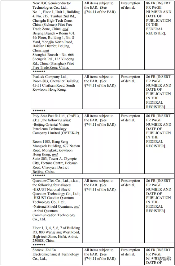 實(shí)體清單是 BIS 使用的一種工具,用于將受 EAR 約束的物品的出口、再出口和國(guó)內(nèi)轉(zhuǎn)移限制在合理認(rèn)為涉及、已經(jīng)涉及或造成重大影響的個(gè)人(個(gè)人、組織、公司)參與或參與違反美國(guó)國(guó)家安全或外交政策利益的活動(dòng)的風(fēng)險(xiǎn)。對(duì)于在此最終規(guī)則中添加到實(shí)體列表中的實(shí)體,BIS 強(qiáng)加了適用于所有受 EAR 約束的項(xiàng)目的許可要求。此外,對(duì)于出口、再出口或國(guó)內(nèi)轉(zhuǎn)移到本規(guī)則中添加到實(shí)體列表的實(shí)體,沒(méi)有許可證例外。BIS 對(duì)這些實(shí)體實(shí)行拒絕推定的許可審查政策。