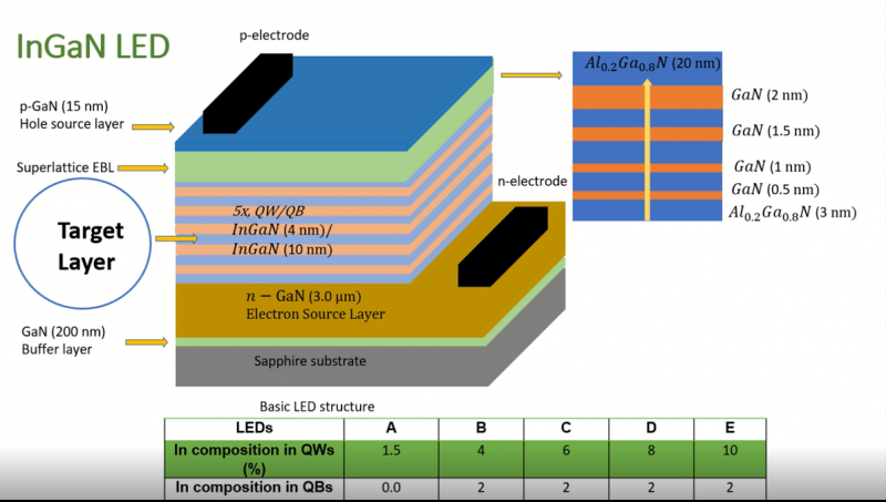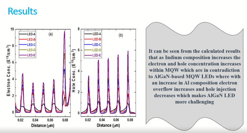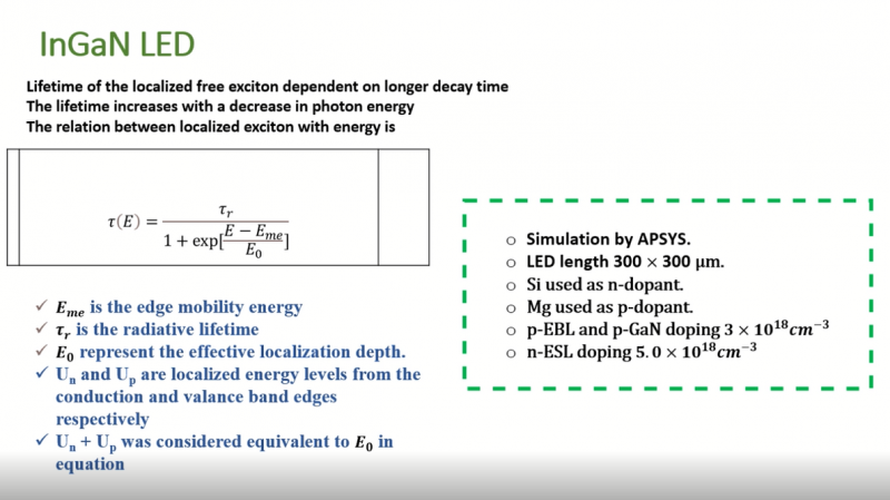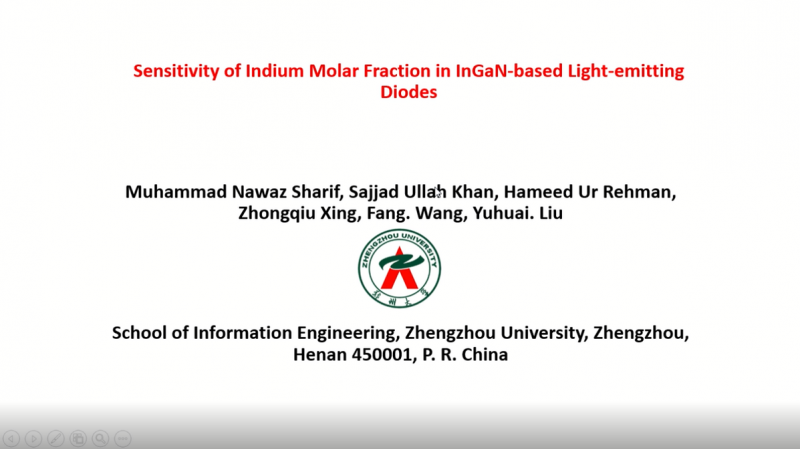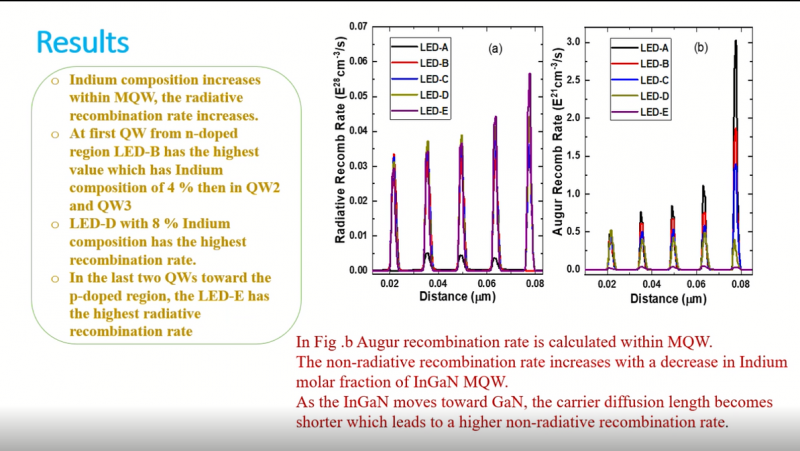 期間,“固態(tài)紫外材料與器件技術(shù)“論壇上,鄭州大學(xué)Muhammad NawazSharif做了題為“銦摩爾分?jǐn)?shù)對InGaN基近紫外發(fā)光二極管光學(xué)性能的影響”的視頻報(bào)告,分享了最新研究成果,報(bào)告顯示,InGaN基量子阱 (QW) 具有更高的穿透位錯密度 (TDD),盡管TDD較高,但QW中的銦 (In) 波動會產(chǎn)生具有較高銦成分的局域激子。定域激子防止結(jié)合載流子非輻射復(fù)合,因銦成分較高而減少的非輻射復(fù)合導(dǎo)致自發(fā)發(fā)射率和內(nèi)量子效率 (IQE) 提高。
