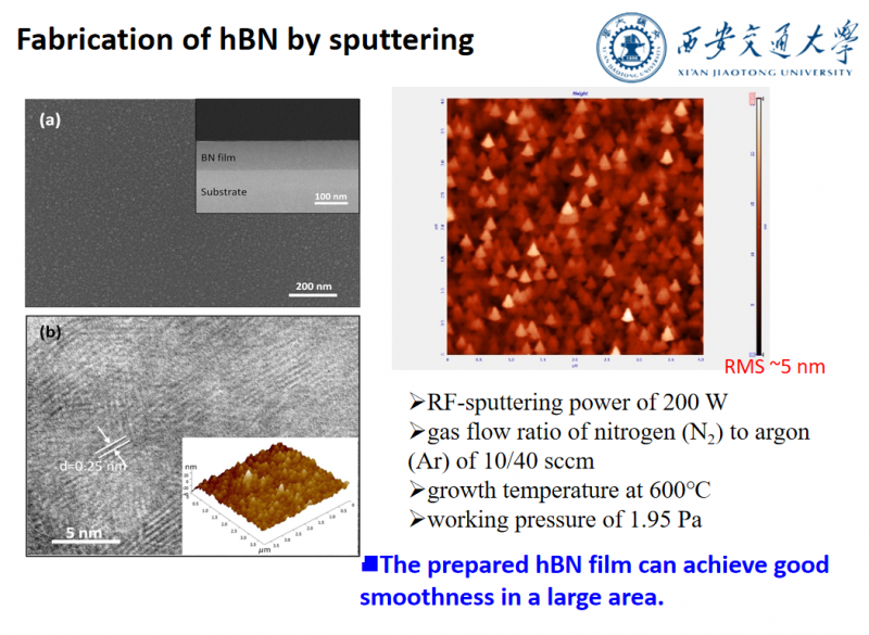 期間,“超寬禁帶半導(dǎo)體材料“論壇上,西安交通大學(xué)電子學(xué)院院長(zhǎng)助理、副教授李強(qiáng)做了題為“BAlN合金中的相變和帶隙工程”的主題報(bào)告,結(jié)合具體的數(shù)據(jù),分享了最新研究成果。報(bào)告指出,采用濺射法制備了高質(zhì)量的 hBN 薄膜并研究了薄膜的特性;制備的hBN薄膜可以在大面積上獲得良好的光滑度;濺射制備的hBN薄膜的RS行為首先在Ag/hBN/Al結(jié)構(gòu)中觀察到;由BN和BAlN薄膜組成的DBR可以在UVB波段實(shí)現(xiàn)高反射;制備了h-BAlN和 w-BAlN,并獲得了相變的證據(jù)。