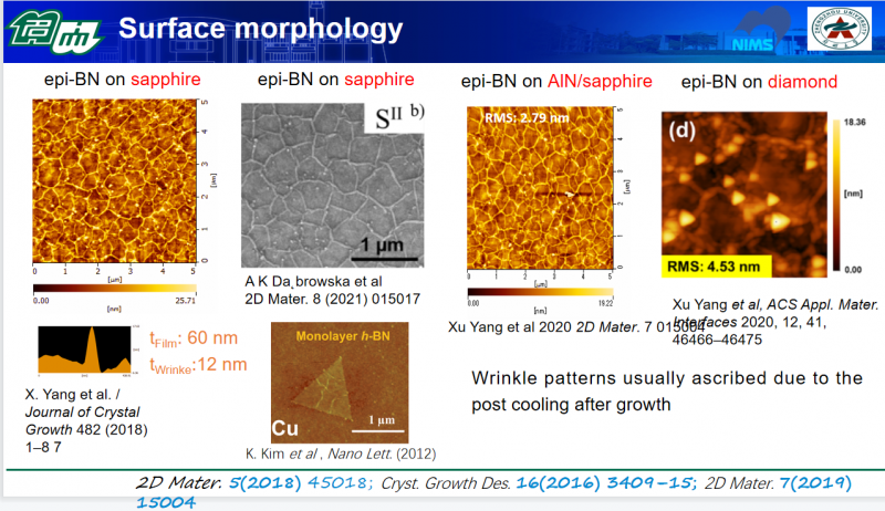 期間,“超寬禁帶半導(dǎo)體材料“論壇上,鄭州大學(xué)電子材料與系統(tǒng)國際聯(lián)合研究中心主任、教授劉玉懷做了題為“六方氮化硼薄膜在不同襯底上的生長研究綜述”的主題報(bào)告。六方相氮化硼薄膜(hBN)可望應(yīng)用于深紫外發(fā)光器件、中子探測器件以及電子器件的襯底層、介質(zhì)層或絕緣層,近年來hBN研究成果吸引了大量關(guān)注。報(bào)告展示hBN在不同襯底上的生長比較,包括藍(lán)寶石襯底、氮化鋁/藍(lán)寶石模板、氮化鋁襯底以及金剛石襯底等。分享了在藍(lán)寶石、AlN/藍(lán)寶石模板和金剛石襯底上生長的BN,觀察到在不同基板上生長的所有BN薄膜的皺紋圖案,可以看到生長的BN膜具有六重對稱性,表明形成了六邊形BN,B(~190 eV)和N(~401 eV)的K邊上的π*和σ*能量損失等最新研究成果。
