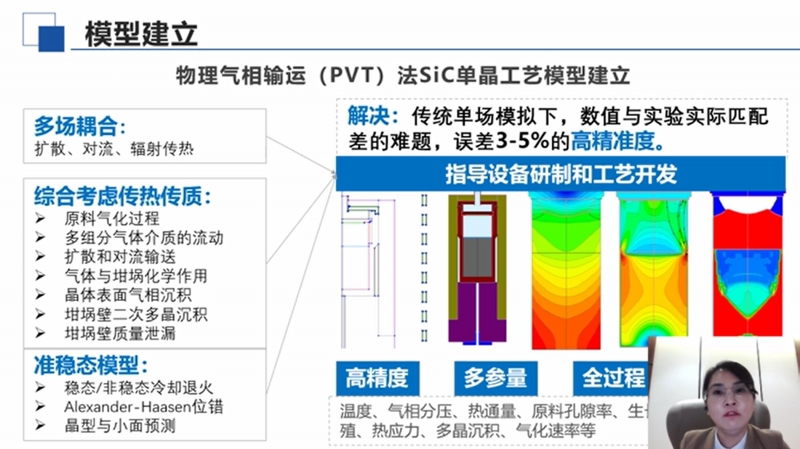 報(bào)告指出,面向半導(dǎo)體晶體材料制備及高端設(shè)備自主研制的迫切需求,研究了應(yīng)用全過(guò)程、全動(dòng)態(tài)的數(shù)值模擬,可視化復(fù)雜反應(yīng),多相工藝過(guò)程。建立模型、精準(zhǔn)揭示晶體生長(zhǎng)參數(shù)、設(shè)備環(huán)境,工藝過(guò)程之間相互作用。解析PVT法晶體材料的制備過(guò)程,解決碳化硅、氮化鋁等材料制備效率,界面調(diào)控等難題。報(bào)告還具體介紹了缺陷控制解決辦法、成本控制等內(nèi)容。