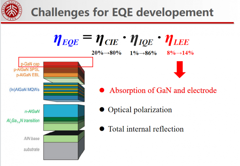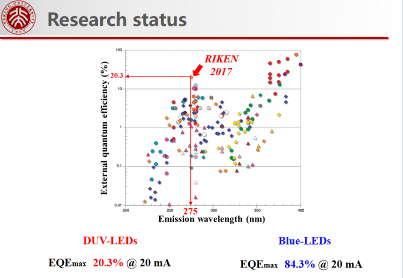 報(bào)告指出,經(jīng)過(guò)國(guó)內(nèi)外課題組20多年的研究,目前AlGaN基深紫外LED性能已經(jīng)得到明顯的提升,但是深紫外LED的外量子效率仍處于很低的水平,報(bào)道的最高外量子效率僅有20.3%,但是普遍低于10%,相比于藍(lán)光LED 高于80%的外量子效率來(lái)說(shuō),差距仍然很大。