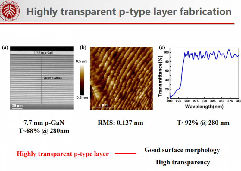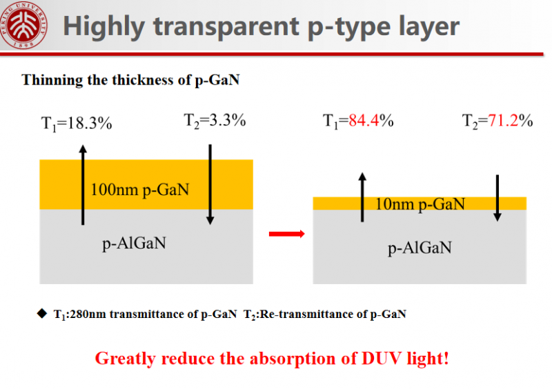 針對(duì)提升光提取效率中,p-GaN層吸收紫外光與p-AlGaN層上形成歐姆接觸困難的問(wèn)題,研究設(shè)計(jì)了一種透明復(fù)合p型層結(jié)構(gòu),包括一層高透明p-AlGaN層和一層幾納米厚的p-GaN層。通過(guò)計(jì)算,將P-GaN的厚度從普遍采用的100nm減薄到10nm,就能使二次透光率提升70%,極大地減小了厚p-GaN層對(duì)深紫外光的強(qiáng)烈吸收,同時(shí)解決了p型歐姆接觸困難的問(wèn)題。