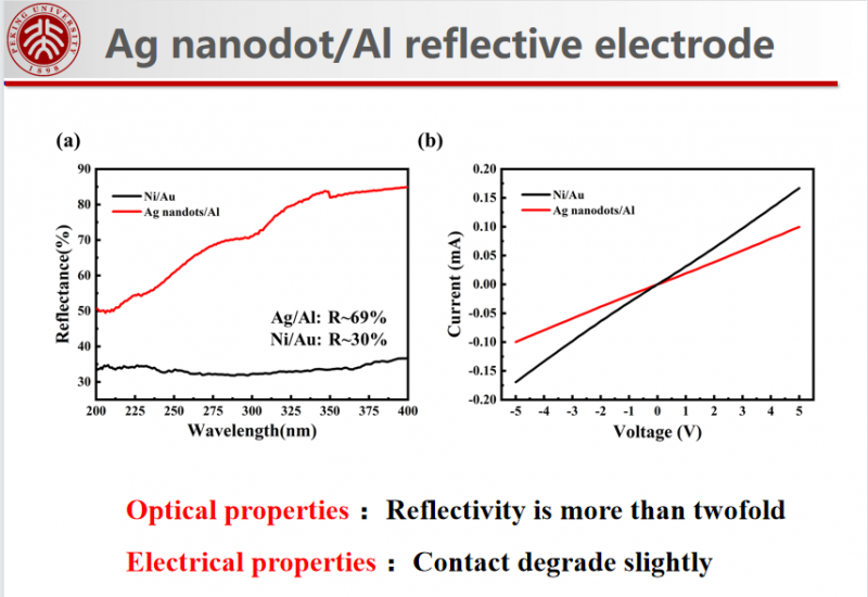 進(jìn)一步,針對(duì)p型接觸金屬對(duì)深紫外光的吸收,設(shè)計(jì)了Ag 納米點(diǎn)/Al 反射電極。Ag是與p-GaN形成歐姆接觸常用的金屬,但是Ag金屬薄膜對(duì)深紫外光吸收強(qiáng)烈。我們利用Ag在一定溫度下會(huì)團(tuán)簇的特性,形成銀納米點(diǎn)降低占空比,增大透射率。未被Ag納米點(diǎn)覆蓋的區(qū)域通過(guò)深紫外波段反射率最高的Al金屬實(shí)現(xiàn)光的反射。在保證歐姆接觸形成的前提下,提高反射率。