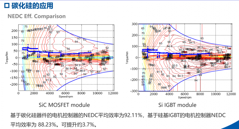 基于氮化鎵的電機(jī)控制器最高效率可到99.2%,效率大于90%的面積占比為93.58%。基于硅基IGBT的電機(jī)控制器最高效率可到98.3%,效率大于90%的面積占比為83.94%。