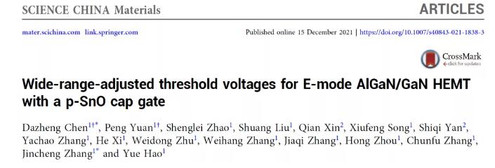 Dazheng Chen, Peng Yuan, Shenglei Zhao, et al. Wide-range-adjusted threshold voltages for E-mode AlGaN/GaN HEMT with a p-SnO cap gate. SCIENCE CHINA Materials, https://doi.org/10.1007/s40843-021-1838-3