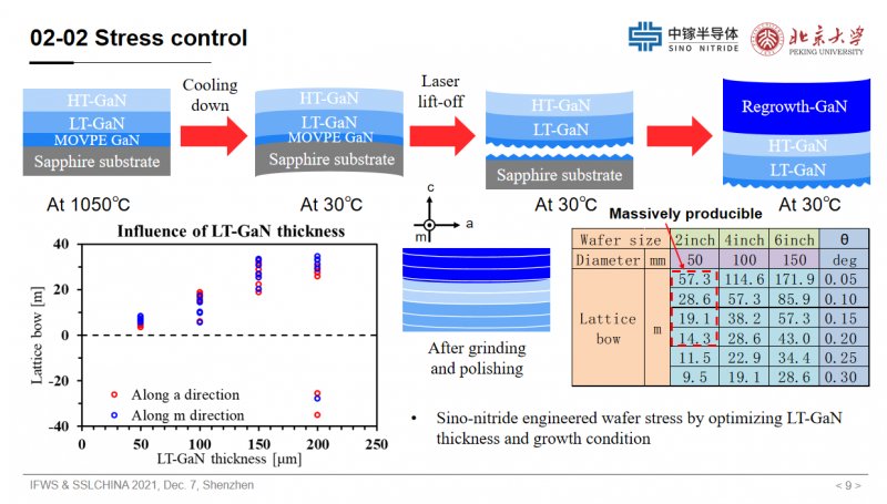 通過結(jié)合LT-GaN插入層和激光剝離技術(shù),Sino-nitride具有大規(guī)模生產(chǎn)FS-GaN襯底的能力。通過優(yōu)化LT-GaN層厚度和生長條件,F(xiàn)S-GaN產(chǎn)品無法達(dá)到更好的切割角均勻度(<0.2)、更低的位錯密度(>4×105 cm-2)和更好的表面狀態(tài)(RSM<0.1nm)。半絕緣 FS-GaN 襯底是用CH4 摻雜劑實(shí)現(xiàn)的,室溫電阻率超過 109 Ω·cm。通過應(yīng)力工程實(shí)現(xiàn)載流子濃度高于3×1018 cm-3的高導(dǎo)電FS-GaN襯底。