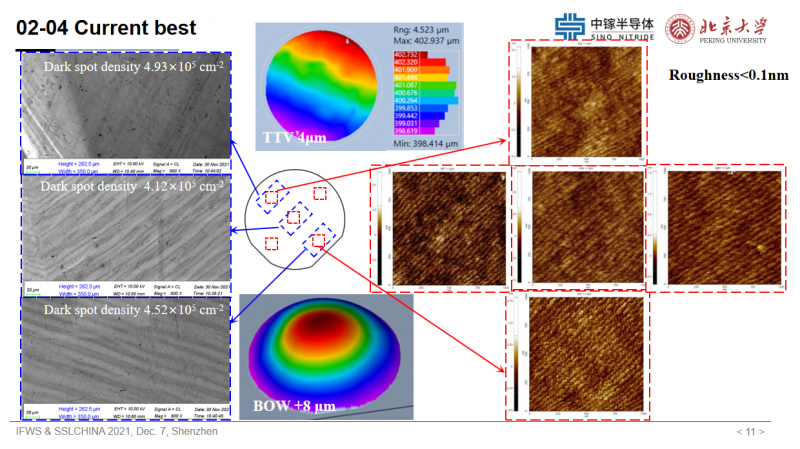 期間,“氮化物半導(dǎo)體襯底與外延技術(shù)“分論壇上,中鎵半導(dǎo)體科技有限公司顧問劉強(qiáng)做了題為“2英寸低位錯密度高電導(dǎo)率和半絕緣氮化鎵自支撐襯底的生長”的主題報告,結(jié)合用于PA應(yīng)用的HEMT、用于LD的高導(dǎo)電GaN襯底、用于PND的高導(dǎo)電GaN 襯底的狀況,分享了應(yīng)力和錯位控制、電導(dǎo)控制的研究進(jìn)展。
