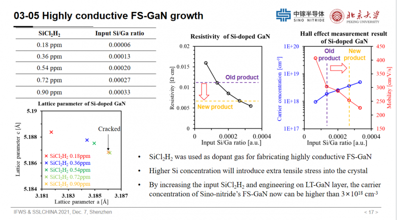 所有使用HVPE的 FS-GaN制造技術(shù)的有兩個關(guān)鍵問題,一是如何控制生長過程中的應(yīng)力以避免開裂,二是如何從異物襯底上剝離GaN層。報告詳細(xì)介紹了通過碳摻雜實(shí)現(xiàn)半絕緣 GaN 生長、碳摻雜 GaN 中的雜質(zhì)濃度、碳摻雜氮化鎵的電學(xué)特性、半絕緣FS-GaN參數(shù)選擇、高導(dǎo)電FS-GaN生長等內(nèi)容。