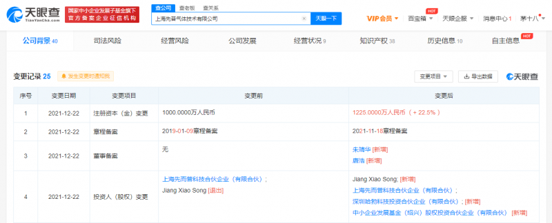 12月22日,上海先普氣體技術(shù)有限公司(以下簡稱“上海先普”)工商信息發(fā)生變更,注冊資本由1000萬元增至1225萬元,增幅22.5%,同時新增深圳哈勃等為股東。天上海先普氣體技術(shù)有限公司日前發(fā)生工商變更,注冊資本由1000萬元增至1225萬元,新增華為關(guān)聯(lián)公司深圳哈勃科技投資合伙企業(yè)(有限合伙)為股東,持股10.20408%。