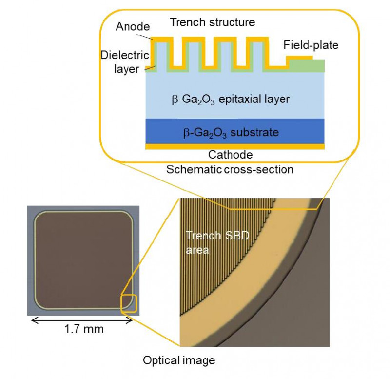 圖2β-Ga2O3溝槽型SBD的橫截面結(jié)構(gòu),光學(xué)顯微照片