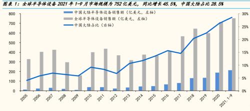 需求端,2021年前三季度,中國大陸市場規(guī)模為215億美元,同比增長57%,占比提升至29%,為全球第一大市場。根據(jù)SEMI的最新預(yù)測,預(yù)計(jì)2021年原始設(shè)備制造商的半導(dǎo)體制造設(shè)備全球銷售總額將達(dá)到1030億美元的新高,比 2020 年的712億美元的歷史記錄增長45%,2022年全球半導(dǎo)體制造設(shè)備市場總額將擴(kuò)大到1140億美元,同比增長11%。