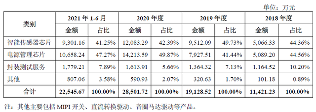 燦瑞科技是一家從事高性能數(shù)模混合集成電路及模擬集成電路研發(fā)設(shè)計(jì)、封裝測(cè)試和銷售的芯片廠商,采用“Fabless+封裝測(cè)試”的經(jīng)營(yíng)模式。公司主要產(chǎn)品及服務(wù)包括智能傳感器芯片、電源管理芯片及封裝測(cè)試服務(wù),截至2021年6月末,三塊業(yè)務(wù)營(yíng)收占比分別為41.25%、47.27%、7.89%。