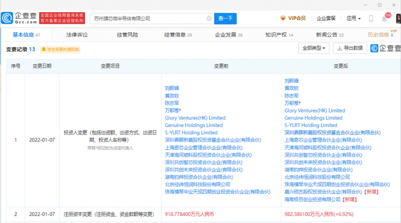 據(jù)企查查信息,1月7日,蘇州旗芯微半導(dǎo)體有限公司(以下簡稱“旗芯微半導(dǎo)體”)發(fā)生工商變更,新增海南極目創(chuàng)業(yè)投資有限公司、嘉興頎杰股權(quán)投資合伙企業(yè)(有限合伙)為股東。同時,旗芯微半導(dǎo)體注冊資本由918.78萬元增至約982.39萬元人民幣,增幅為6.92%。