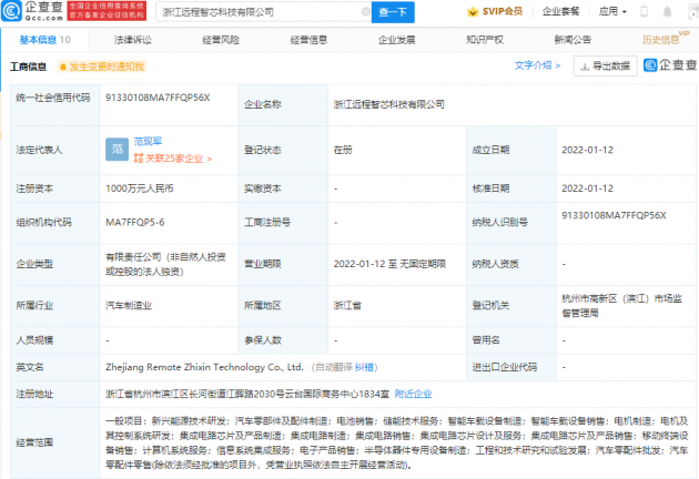 企查查APP顯示,1月12日,浙江遠(yuǎn)程智芯科技有限公司成立,注冊(cè)資本1000萬(wàn)元人民幣,經(jīng)營(yíng)范圍包含:新興能源技術(shù)研發(fā);集成電路制造;集成電路銷(xiāo)售;集成電路芯片設(shè)計(jì)及服務(wù);集成電路芯片及產(chǎn)品銷(xiāo)售等。企查查股權(quán)穿透顯示,該公司由吉利關(guān)聯(lián)公司浙江遠(yuǎn)程商用車(chē)研發(fā)有限公司100%控股。