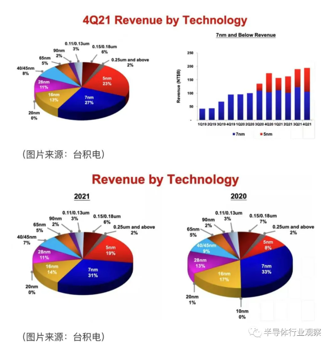 根據(jù)公司提供的數(shù)據(jù),臺(tái)積電的 N7 和 N5 節(jié)點(diǎn)占臺(tái)積電 2021 年第四季度 157.4 億美元晶圓收入的約 50%(同比增長(zhǎng) 24.1%,環(huán)比增長(zhǎng) 5.8%)。這兩種制造技術(shù)也占臺(tái)積電全年 568.2 億美元晶圓收入的 50%。2020年,它們占臺(tái)積電455.1億美元收入的41%。