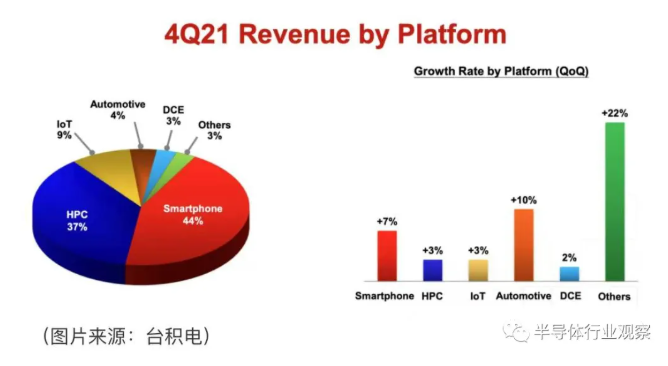 在應(yīng)用方面,智能手機(jī)芯片的銷售額占臺(tái)積電收入的比例從 2020 年第四季度的 51% 下降到 2021 年第四季度的 44%。同時(shí),用于 PC、服務(wù)器、超級(jí)計(jì)算機(jī)和游戲機(jī)(臺(tái)積電稱之為高性能計(jì)算 (HPC) 應(yīng)用程序)從 2020 年第四季度的 31% 上升到 2021 年第四季度的 37%。