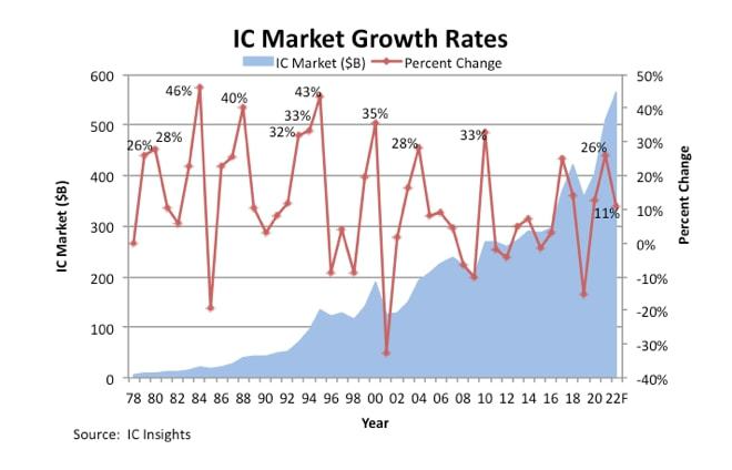 1月18日,根據(jù)IC Insights發(fā)布的行業(yè)快報,繼 2021 年勁增長26% 和 2020 年躍升 13% 之后,IC 市場今年將增長 11%(圖1)。如果達成,這將意味著 IC 行業(yè)25 年來首次連續(xù)三年實現(xiàn)兩位數(shù)增長。而上一次出現(xiàn)這一增長是在1992-1995年期間。