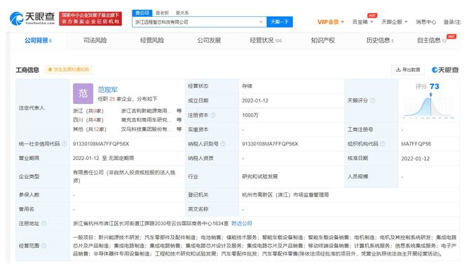 天眼查顯示,1月12日,浙江遠(yuǎn)程智芯科技有限公司成立,法人代表為范現(xiàn)軍,注冊(cè)資本為1000萬元。天眼查關(guān)聯(lián)信息顯示,范現(xiàn)軍同時(shí)為吉利四川商用車有限公司/江西吉利新能源商用車有限公司董事長(zhǎng)。