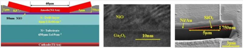 團隊一直致力于高性能β相氧化鎵功率器件研制和相關機理研究,自主創(chuàng)新了變溫回流小角度斜場板和p型NiO異質結終端擴展等新型終端結構和技術,成功解決了p型氧化鎵摻雜技術缺失導致的耐壓和功率品質因子低的瓶頸問題,研制的β相氧化鎵功率二極管耐壓提升1倍以上,功率品質因子達到5.18GW/cm2,國際上首次超越了SiC材料理論極限值,驗證了氧化鎵材料和器件在電力電子領域潛在的應用價值,相關技術有望推進氧化鎵功率器件工程化應用進程。相關結果發(fā)表在功率器件領域權威期刊上。
