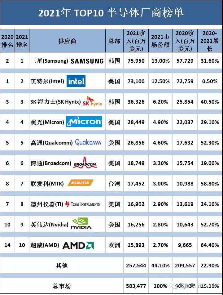 廠(chǎng)商排名方面,三星(Samsung)超過(guò)英特爾(Intel),成為頂級(jí)芯片銷(xiāo)售商。2021年三星的半導(dǎo)體收入激增31.6%,達(dá)到759億美元。該公司上一次排名第一是在2018年。