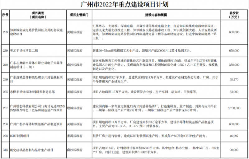 據(jù)全球半導(dǎo)體觀察了解,在廣州市2022年重點項目計劃中,涵蓋多個半導(dǎo)體產(chǎn)業(yè)項目,涉及模擬芯片、碳化硅芯片、MEMS傳感器等領(lǐng)域。例如,重點建設(shè)項目計劃包括粵芯半導(dǎo)體項目二期項目、廣東芯粵能半導(dǎo)體有限公司電子元器件制造項目(一期)、廣東盈驊總部和微處理芯片封裝載板項目、志橙半導(dǎo)體SiC材料研發(fā)制造總部等。