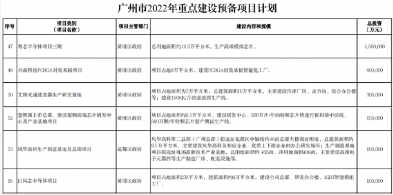 重點建設(shè)預(yù)備項目計劃包括粵芯半導(dǎo)體項目三期、興森科技FCBGA封裝基板項目、艾佛光通濾波器生產(chǎn)研發(fā)基地、風(fēng)華高科生產(chǎn)制造基地及總部項目等。以下為廣州市2022年重點項目計劃部分半導(dǎo)體產(chǎn)業(yè)項目: