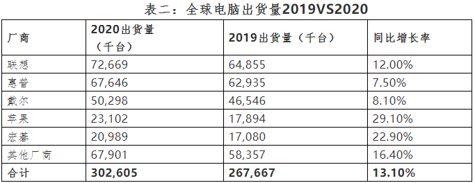 表二展示了2020年全球前五大傳統(tǒng)PC廠商出貨量和同比增長率。