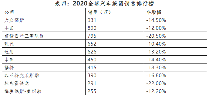 在2021年,汽車生產(chǎn)最缺芯。表四展示了2020年全球汽車集團銷售排行榜。