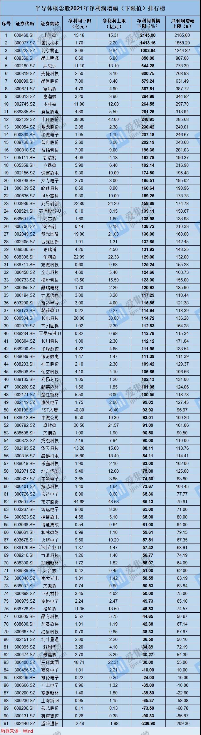 在凈利潤(rùn)增幅方面,91家半導(dǎo)體公司中,2020年凈利潤(rùn)同比增長(zhǎng)(下限值)的公司共計(jì)83家,占比91.21%。其中,同比增幅超過(guò)200%的有15家,同比增幅在100%-200%的有33家,同比增幅在0-100%的有35家,同比下降的公司有8家。