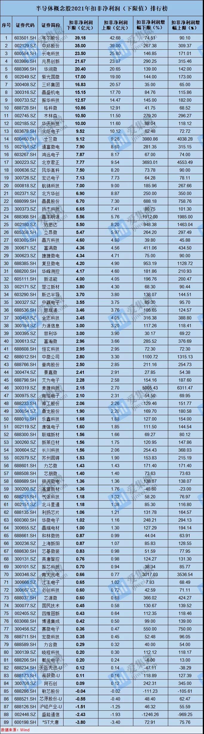 從集微網(wǎng)統(tǒng)計(jì)89家企業(yè)當(dāng)中,有84家公司扣非凈利潤(rùn)(下限值)為正,合計(jì)達(dá)到437億元。另有5家公司扣非凈利潤(rùn)出現(xiàn)虧損,合計(jì)達(dá)到-8.33億元。其中韋爾股份、中環(huán)股份、長(zhǎng)電科技、兆易創(chuàng)新、華潤(rùn)微五家公司扣非凈利潤(rùn)分別為39.18億元、35億元、23.50億元、21.67億元、20.40億元,均超過(guò)20億元。